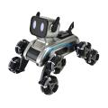 Футуристичний дизайн у сріблястому кольорі, з виразними та дружелюбними оченятами, що одразу привертає увагу. Рухливий та слухняний, песик вміє вставати на задні лапки, їздити у різні сторони, виконувати трюки, команди та навіть віджиматися. Реакція на дотики та звуки завдяки сенсорам, дозволяють песику відповідати на ласку та взаємодіяти з дитиною. Два способи керування на вибір: класичний пульт — керувати легко та зрозуміло інтуїтивно; браслет на руку, що реагує на рухи руки. З пульта можна обирати увімкнення звукових та світлових ефектів. При необхідності можна їх вимкнути. 8 колес з гумовими шинами роликового типу - забезпечують відмінну стійкість та прохідність на будь-яких поверхнях. Завдяки рухливій конструкції колес, вони легко трансформуються та придають собаці різні положення. Є демо-режим, який демонструє всі функції та режими робопесика. Виготовлений з безпечних та міцних матеріалів, стійких до активних ігор.Розвиток: розвиває уяву, логіку, мислення, уважність, емоційне сприйняття, навички турботи.