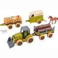 трактор з 2 причепами; викрутка для збирання\розбирання; фігурки тваринок; додаткові аксесуари.
